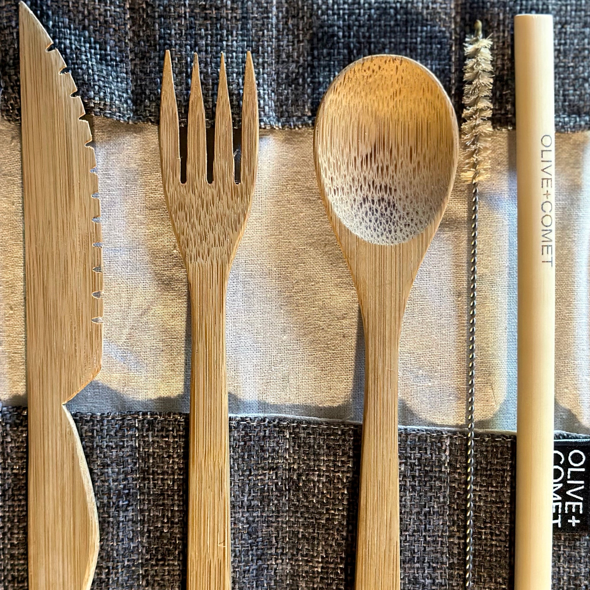 Flatware set includes one each: fork, knife, spoon, straw, straw cleaner & travel pouch.