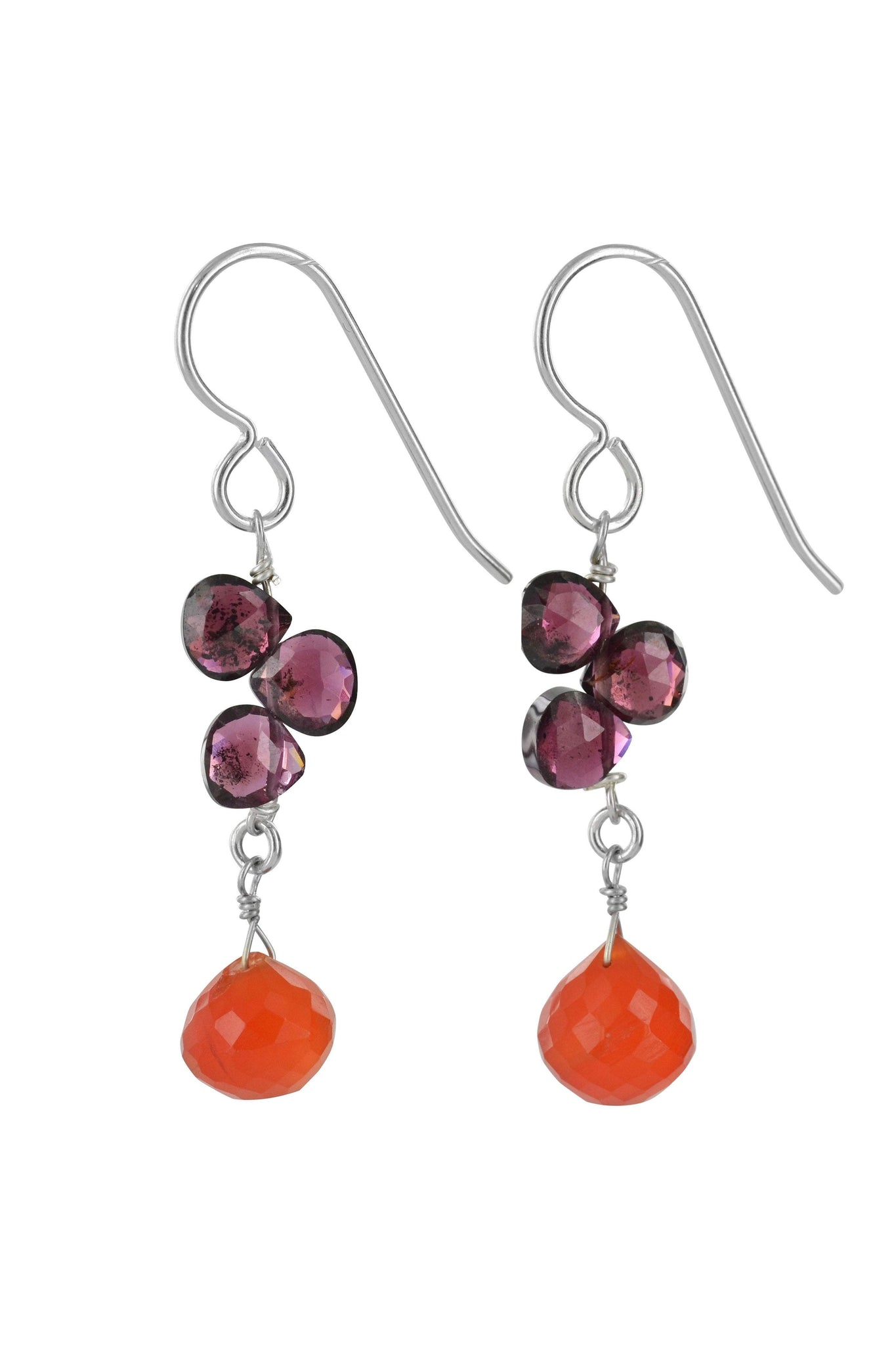 Carnelian earrings accentuated with Rhodolite Garnet gemstones, these colorful earrings are dainty yet striking.