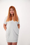 This light gray comfy pocket dress made sustainably will become a comfy addition to your seasonal wardrobe.