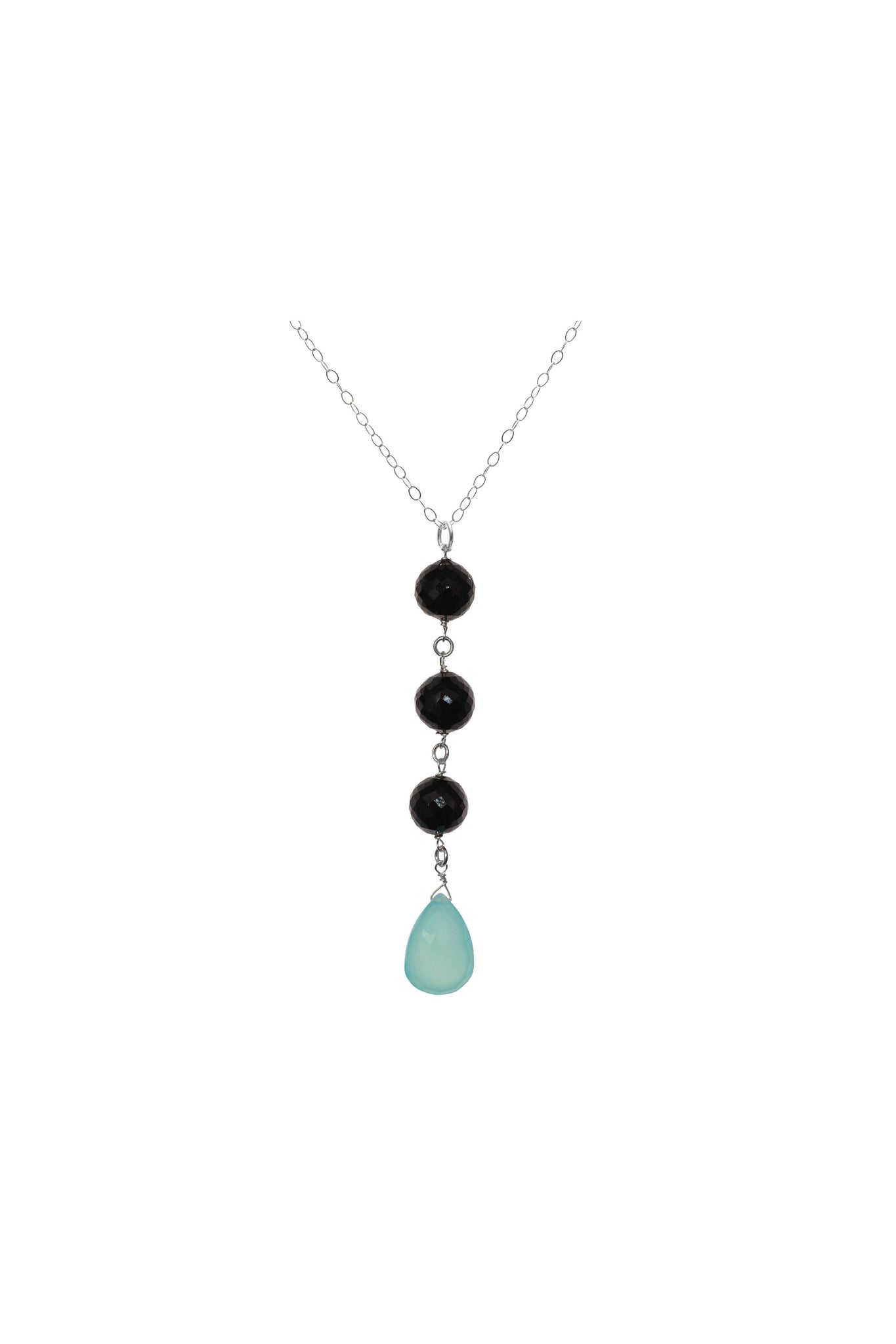 This elegant long dangle necklace is handmade with a Caribbean sea blue aqua chalcedony briolette gemstone, measuring about 4.75 carats, and accentuated by three black spinel gemstone beads.