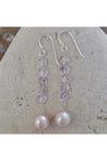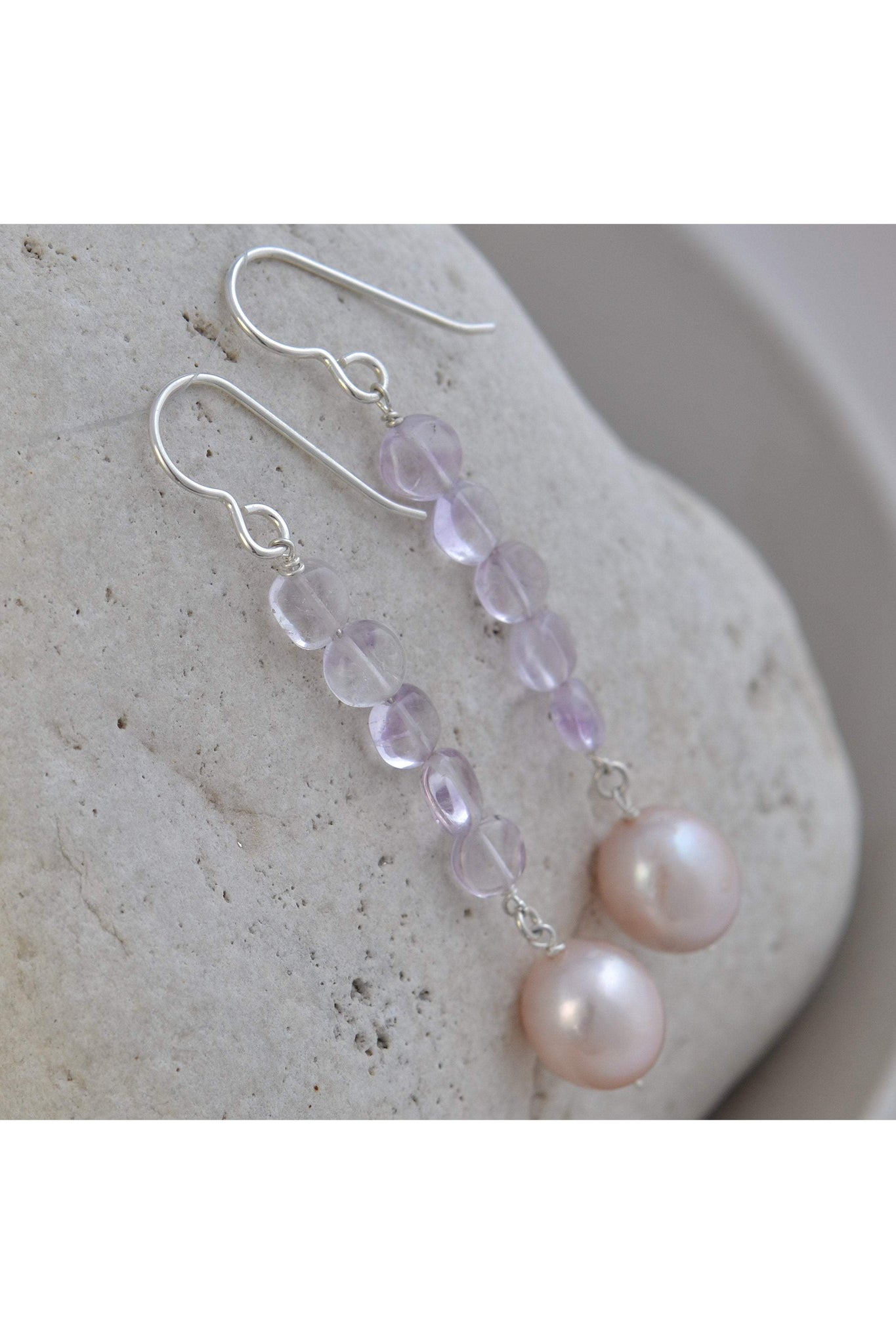 This pair of dangle earrings are handmade with two pink Freshwater Cultured Pearls accentuated by ten pink amethyst gemstone beads.