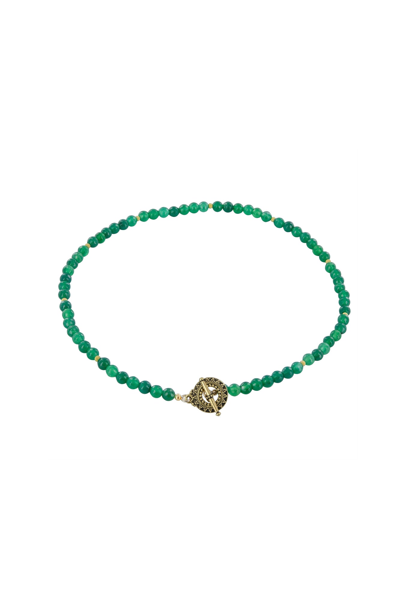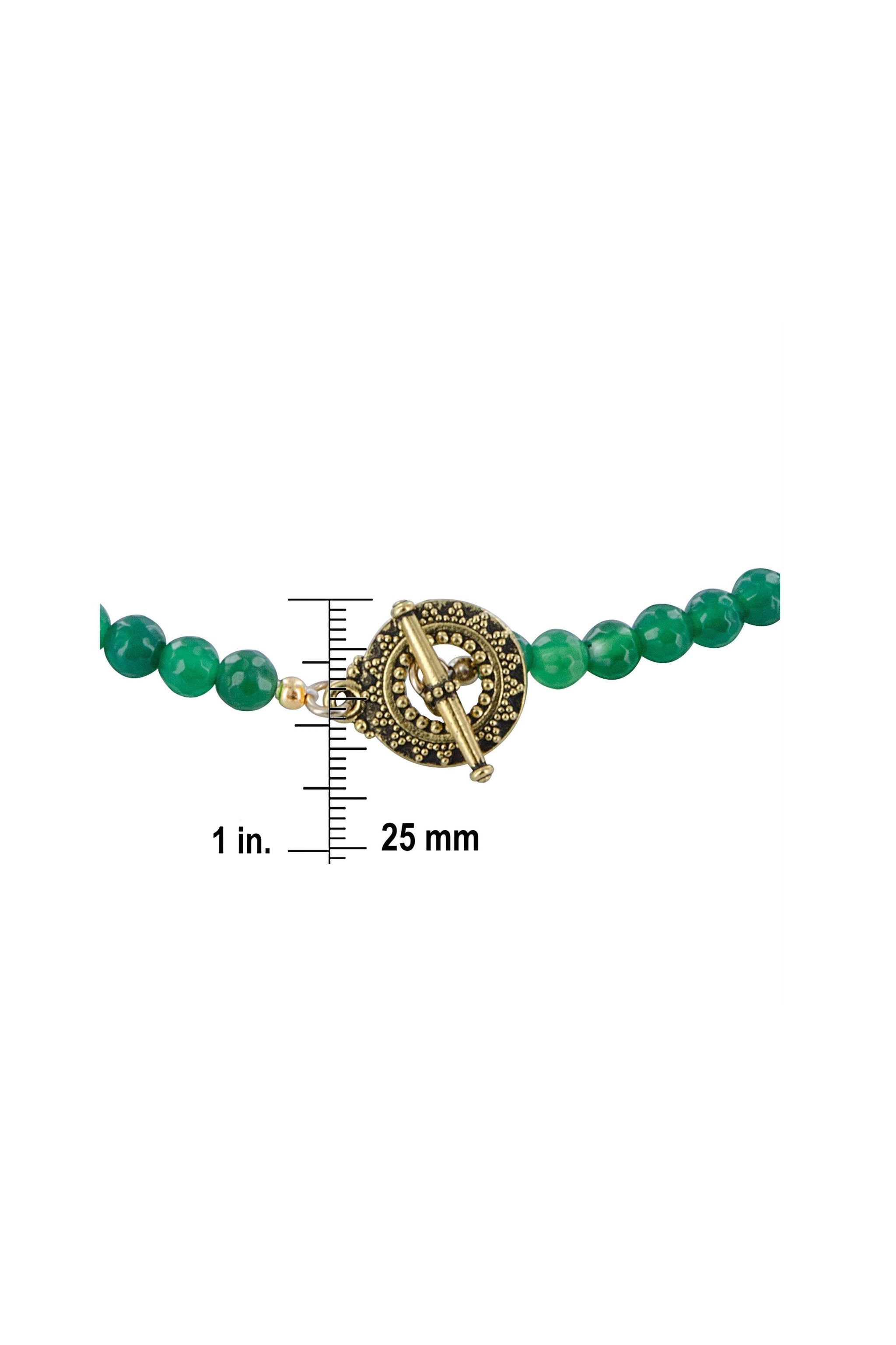 This simple and chic single-strand 18 inch necklace of Green Agate gemstones is the perfect accessory to complement a smart ensemble. The stones are faceted to optimize sparkle and are interspersed with gold Stardust beads. A classic piece of jewelry with a truly modern expression. The bali style pewter toggle clasp adds to its unique beauty.