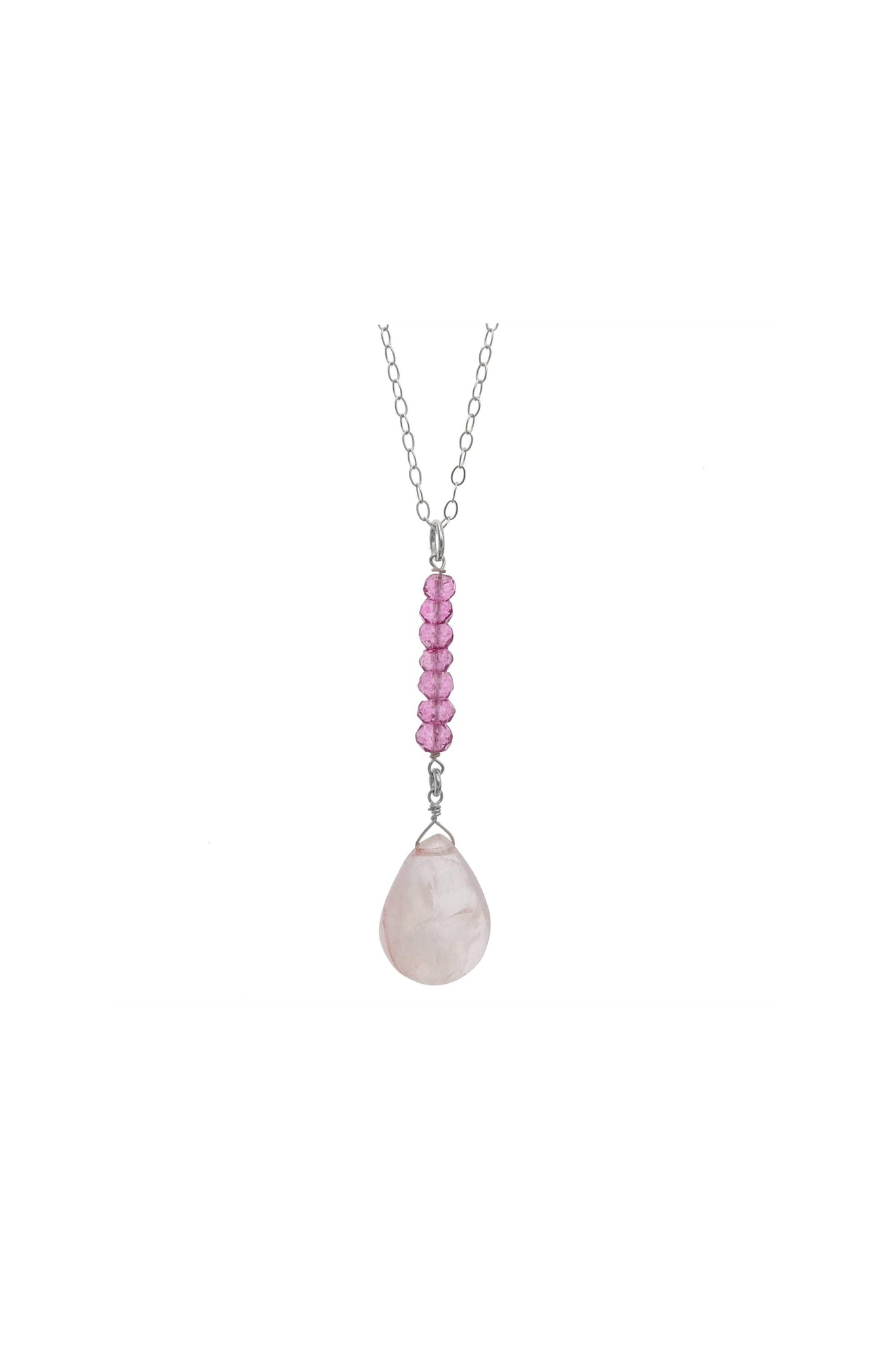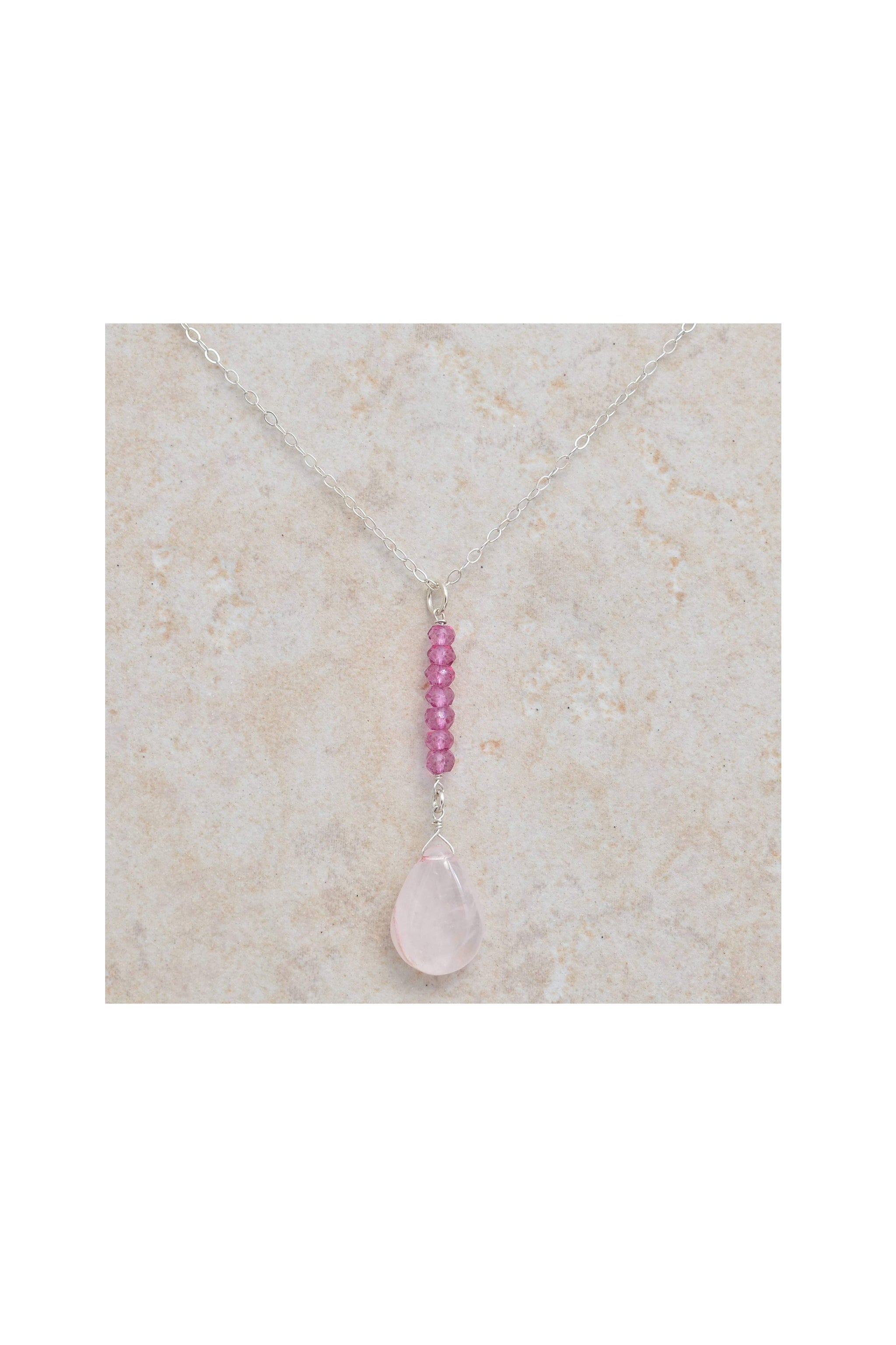 This pretty 18 inch necklace is handmade with a rose quartz polished briolette gemstone, measuring about 4 carats, and accentuated by seven pink quartz faceted rondelle beads.